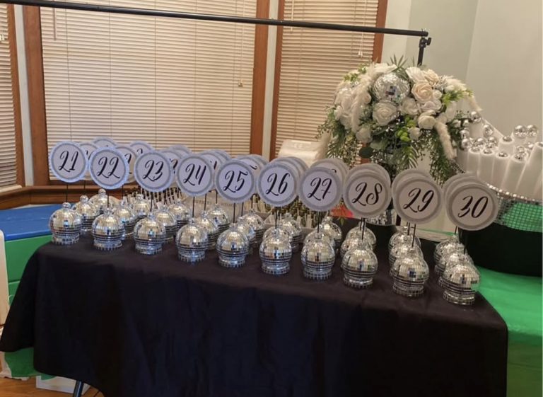 Custom made one of a kind disco ball inspired table numbers 1-30. Glass disco balls not plastic finished on both sides