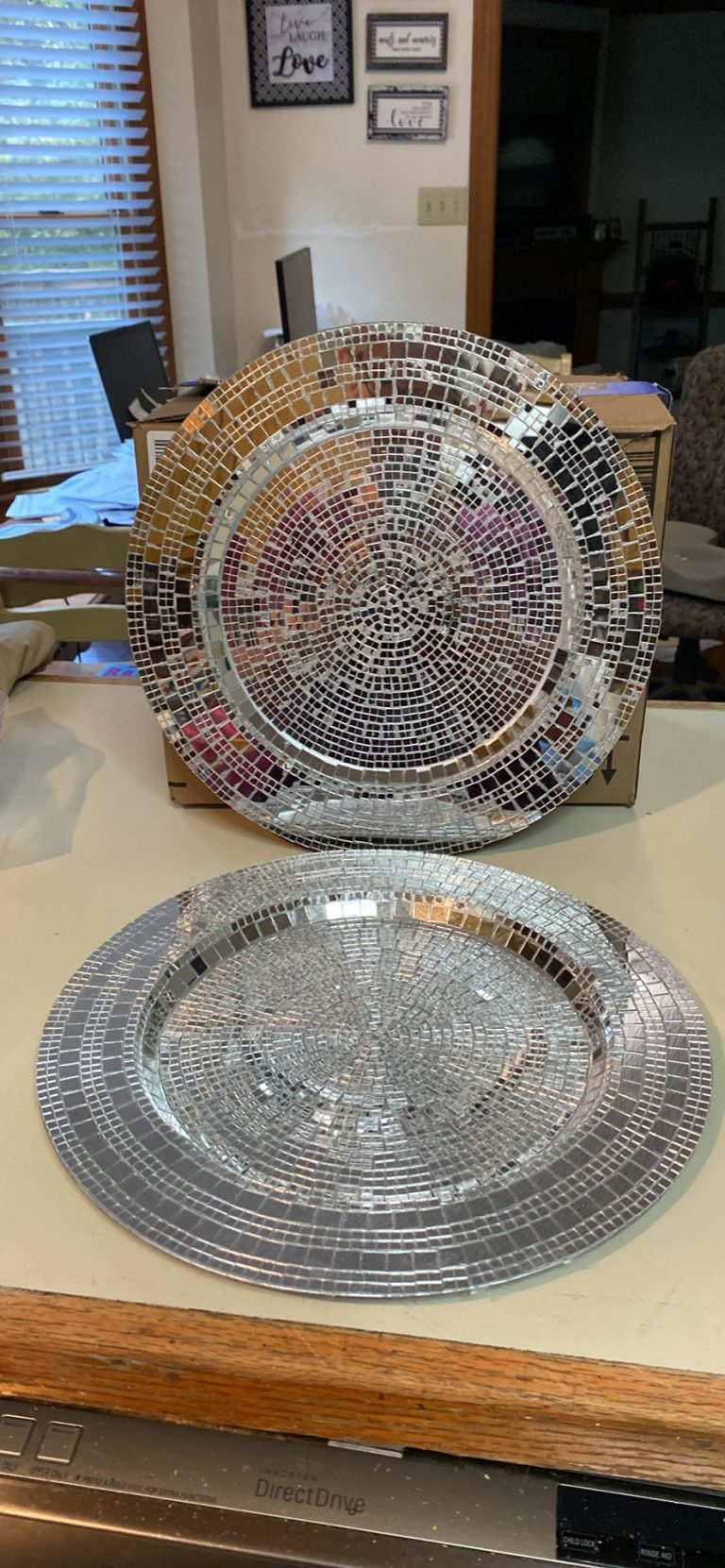 Disco inspired Bride/Groom charger plate set of 2. Custom made one of a kind pieces. Galvanized with all glass disco tiles. Measures 23 1/4” wide