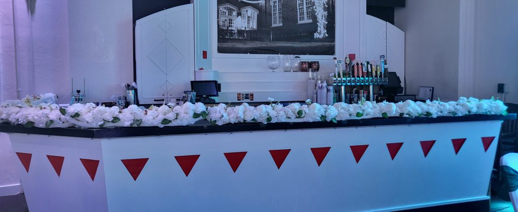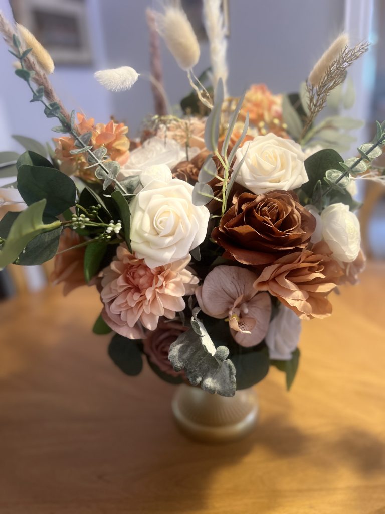 There are two centerpieces made with the gold candlestick that have a floral and feather arrangement, which can be used for other decorative tables (we used one for our favor table and the other for our name card table). The round mirror plates can be sold with the centerpieces for no additional cost.