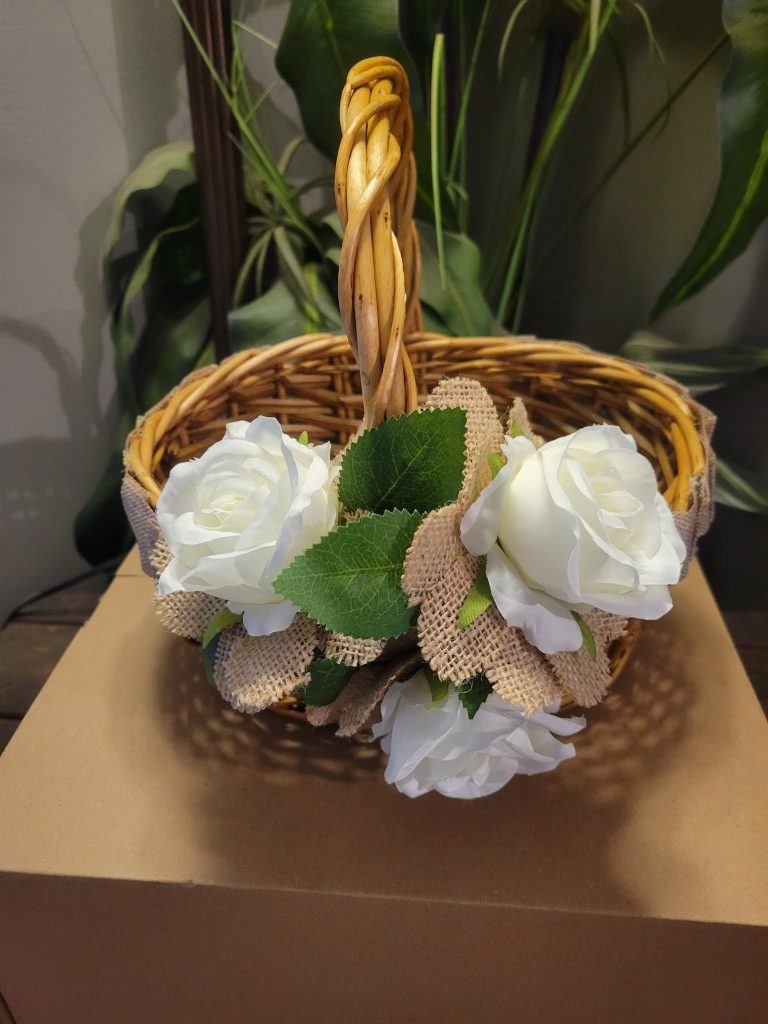 Cute, rustic flower girl basket with burlap and white flowers. Measurements – 10.5in wide, 9in deep, 10in tall (including handle)
