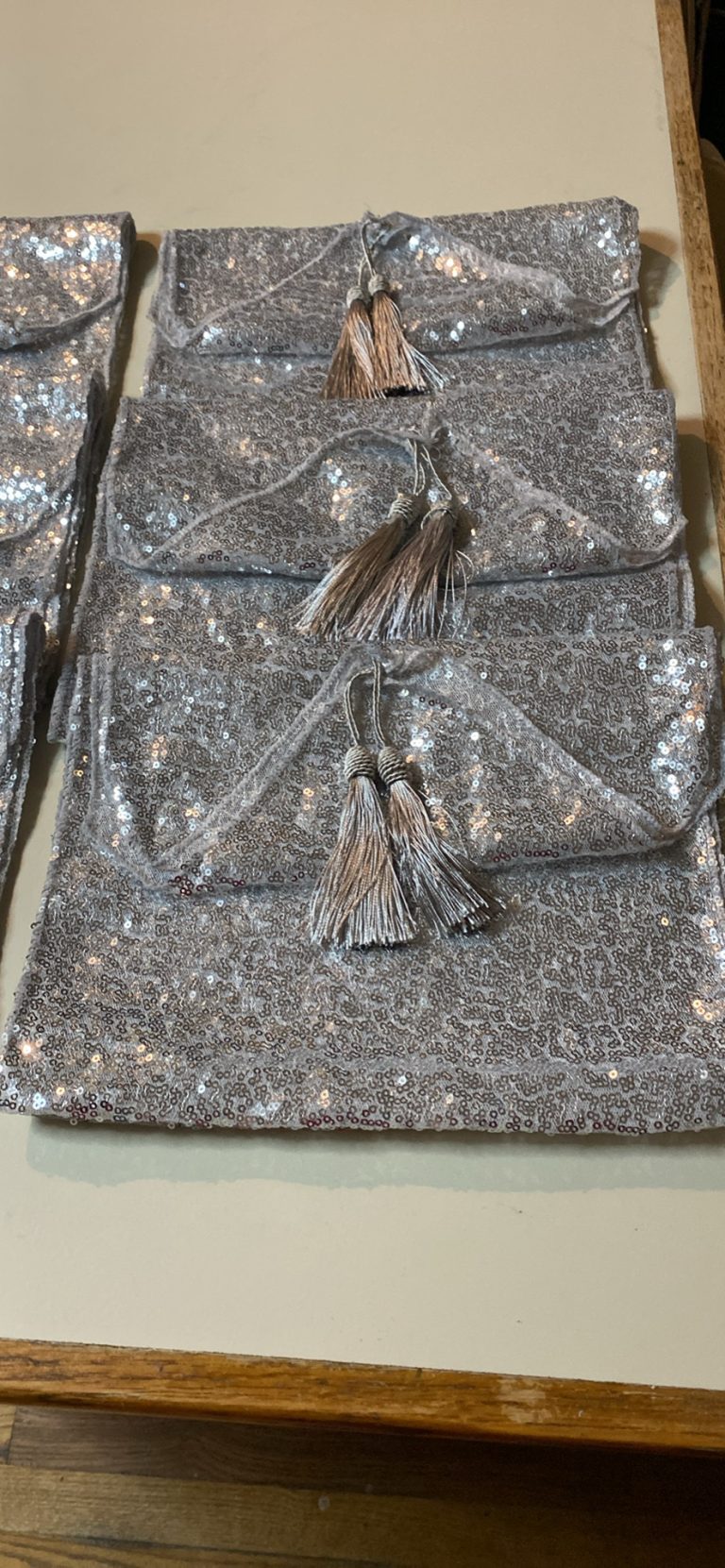 Set of 6 70”x20” silver sequined table runners with tassels. New